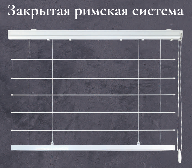 Карниз закрытого типа для римских штор - это цепочно-кордовый механизм закрытого типа. В конструкции этой системы привод вращения и подъемные каретки спрятаны внутри профиля, благодаря этому можно использовать даже очень тонкую ткань - эстетичность композиции не будет нарушена.